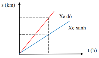 Với cùng một khoảng thời gian từ lúc bắt đầu đến thời điểm t ta thấy xe đỏ đi được quãng đường lớn hơn xe xanh nên xe đỏ đi nhanh hơn xe xanh