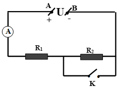 Đặt một hiệu điện thế U vào hai đầu một đoạn mạch có sơ đồ như hình sau, trong đó các điện trở R1 = 3 Ω, R2 = 6 Ω. Hỏi số chỉ của ampe kế khi công tắc K đóng lớn hơn hay nhỏ hơn bao nhiêu lần so với khi công tắc K mở?