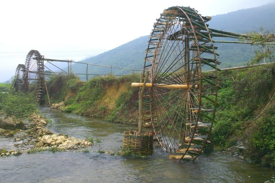 Trong hình ảnh là bánh xe nước (cối xay nước), ứng dụng năng lượng của dòng nước.