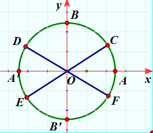Xét đường tròn lượng giác như hình vẽ. Biết , E và D lần lượt là các điểm đối xứng của C và F qua gốc O. Nghiệm của phương trình