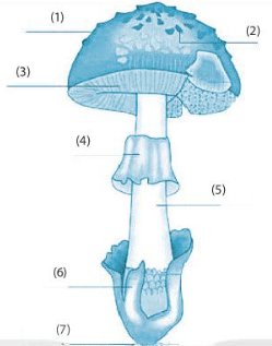 | (5) cuống nấm | (6) bao gốc | (7) sợi nấm |