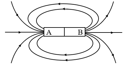 Đường sức từ đang đi ra ở cực B của nam châm nên cực B là cực Bắc, còn cực A đường sức từ đang đi vào nên cực A là cực Nam.