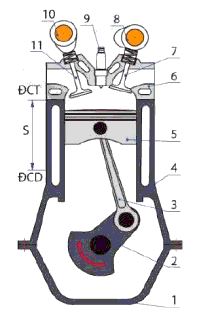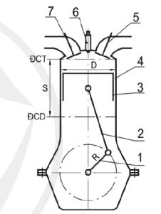 1. Trục khuỷu, 2. Thanh truyền, 3. Pit tông, 4 Xilanh; 5. Xupap xa, 6 Bugi (hoặc với phun), 7 Xupap nạp
