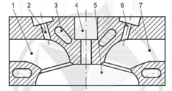 1. Đường nạp. 2. Lỗ lắp xu páp nạp, 3. Áo nước, 4. Lỗ lắp với phun hoặc bugi, 5. Buồng chảy, 6. Lỗ lắp xu páp thải, 7. Đường thải