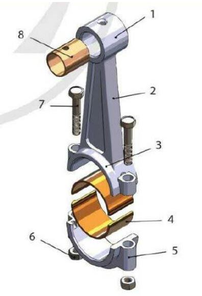 1. Đầu nhỏ, 2 Thần 3. Đầu to 4. Bạc lót đầu to, 5 Nắp đầu to, 6. Đai ốc. 7 Bulông, 8 Bạc lót đầu nhỏ