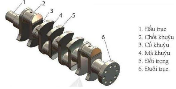 - Cổ khuỷu được lắp với ổ trục trên thân máy, có chốt khuỷu lắp với đầu to thanh truyền và lỗ dẫn dầu bôi trơn.