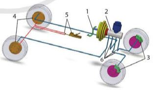 1. Bàn đạp phanh; 2 Xilanh phanh chính và bộ trợ lực; 3. Cơ cấu phanh trước; 4. Cơ cấu phanh sau; 5, Cụm phanh dừng; 6. Đường dầu của dẫn động phanh