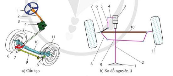 1. Vành tay lái; 2. Trục lái; 3. Cơ cầu lái; 4. Đòn quay đứng; 5. Đòn kéo dọc; 6. Đèn quay ngang; 7. Chốt khớp chuyển hướng; 8 Đón bên; 9. Đòn ngang; 10. Dầm cầu; 11. Bánh xe