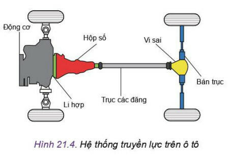 + Hệ thống truyền lực: truyền và biến đổi mô men chủ động đến các bánh xe để xe có thể chuyển động, bao gồm li hợp, hộp số, trục các đăng, truyền lực chính và bộ vi sai.