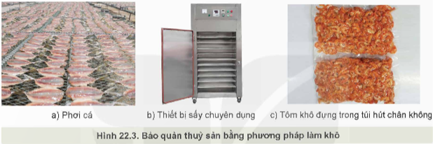 - Nguyên lí: phơi khô thuỷ sản dưới ánh nắng mặt trời hoặc sấy khô bằng các thiết bị chuyên dụng đến một mức độ thích hợp, đóng gói kín bằng túi nylon hoặc túi hút chân không
