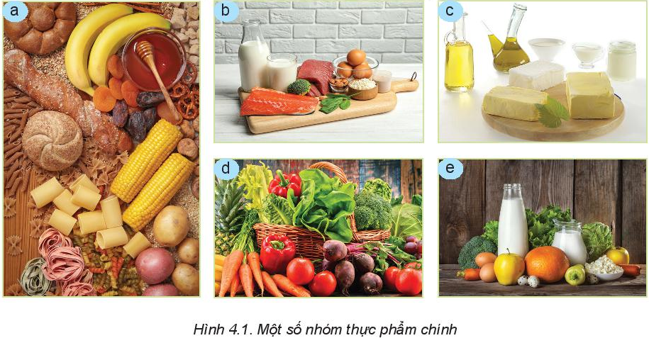 - Những thực phẩm chính: ngũ cốc, bánh mì, khoai, sữa, mật ong, trái cây chín, rau xanh. (Hình 4.1a)