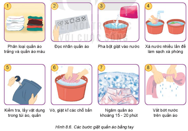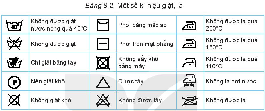 * Cần lưu ý về giặt, là sấy ghi trên quần áo (Bảng 8.2)