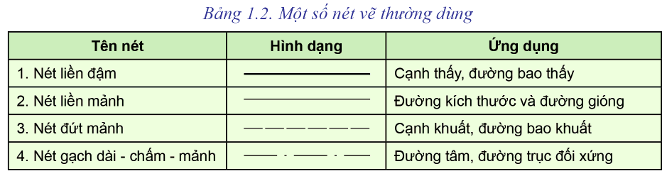 Bảng 1.2 trình bày một số loại nét vẽ cơ bản và ứng dụng các nét vẽ đó theo TCVN 8-24:2002.