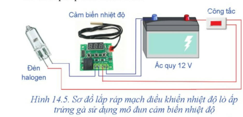 - Ví dụ: Mô hình điều khiển nhiệt độ tự động lò ấp trứng sử dụng mô đun cảm biến nhiệt độ. Đối tượng điều khiển của mô hình là đèn gia nhiệt halogen 12 V, 50 W.