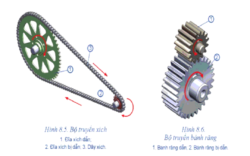- Bộ truyền xích gồm đĩa xích dẫn, đĩa xích bị dẫn và dây xích. Bộ truyền bánh răng gồm các bánh răng ăn khớp trực tiếp.