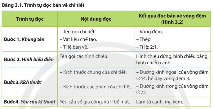 Trình tự đọc bản vẽ chi tiết như Bảng 3.1.