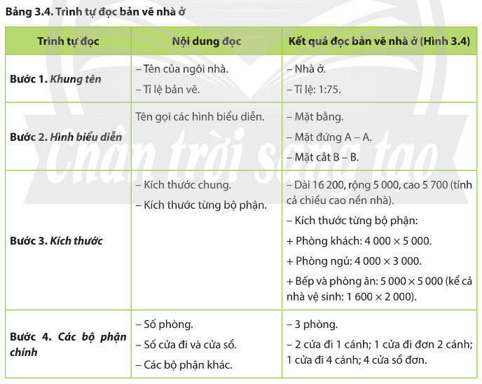 Trình tự đọc bản vẽ nhà như Bảng 3.4.