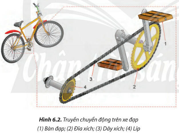 - Ví dụ: chuyển động từ bàn đạp được truyền tới bánh xe sau của xe đạp (Hình 6.2).