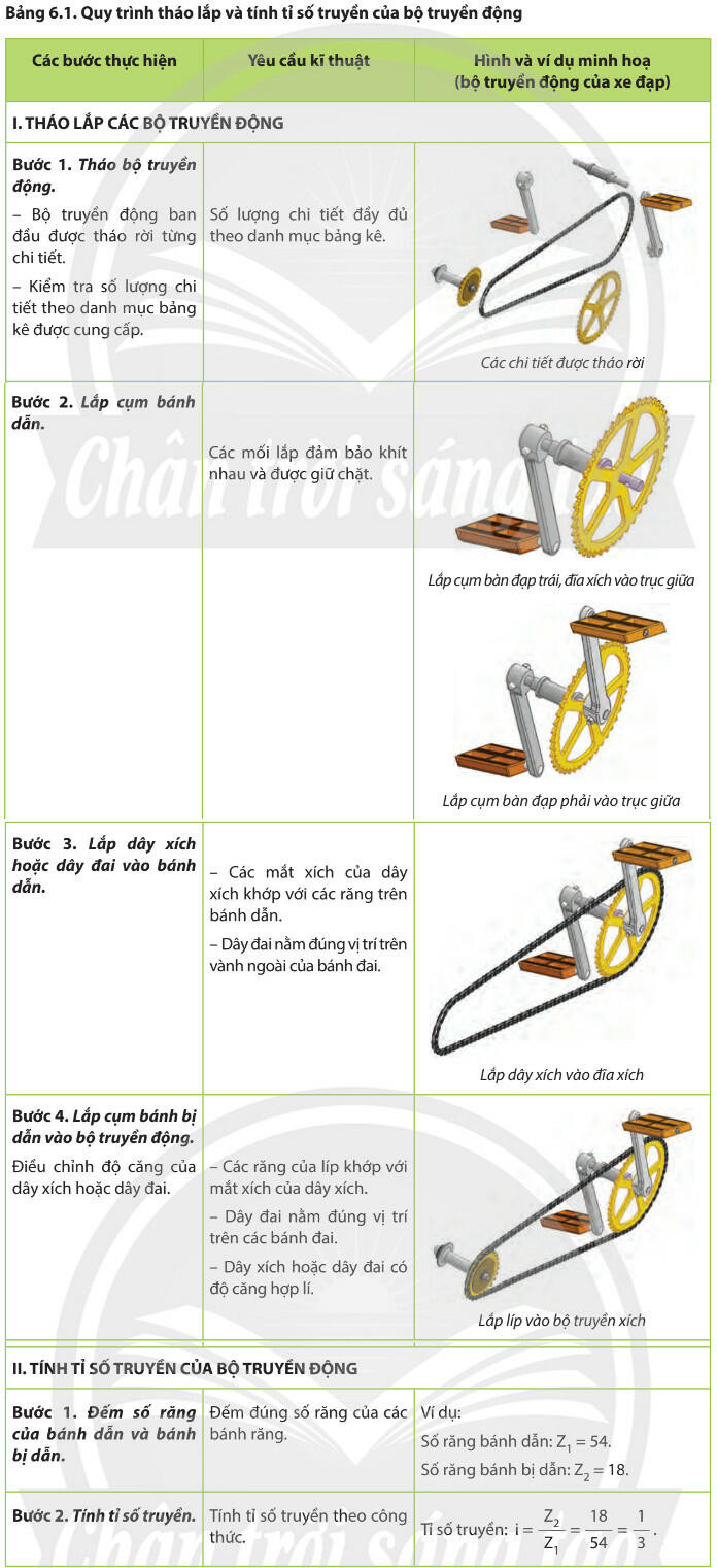 Quy trình tháo lắp và tính tỉ số truyền của bộ truyền động giống như ví dụ ở Bảng 6.1.