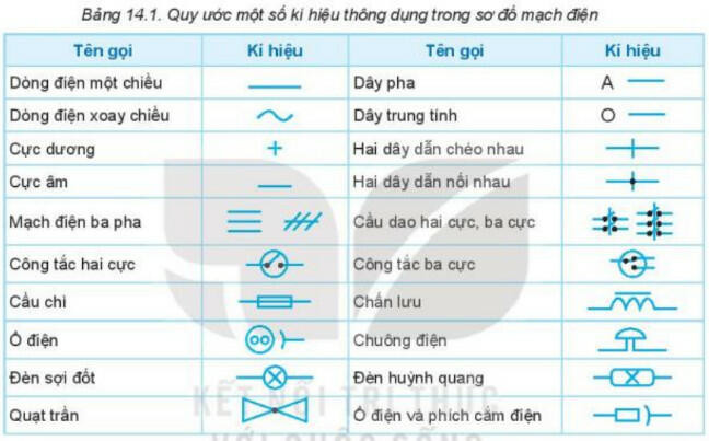 - Trên các sơ đồ mạch điện, người ta sử dụng các kí hiệu quy ước để biểu thị các phần tử trong mạch điện để giúp cho việc thông tin dễ dàng hơn (Bảng 14.1).