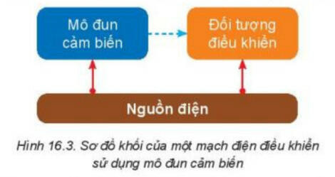 - Mạch điện điều khiển sử dụng mô đun cảm biến thường gồm có một số thành phần chính như mô đun cảm biến, đối tượng điều khiển và nguồn điện (Hình 16.3).