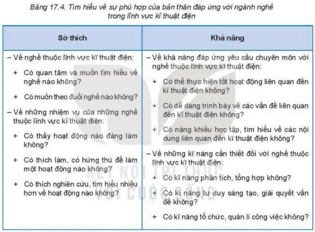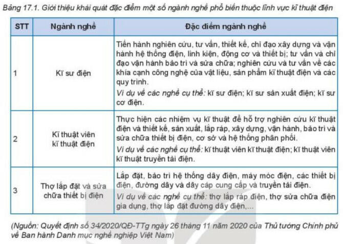 + Mỗi ngành nghề thuộc lĩnh vực kĩ thuật điện sẽ có những yêu cầu riêng về năng lực (Bảng 17.2).