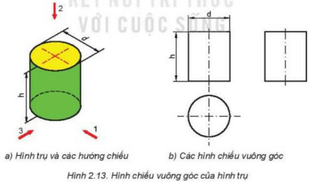 Hình 2.13b trình bày các hình chiếu vuông góc của hình trụ được mô tả ở Hình 2.13a.