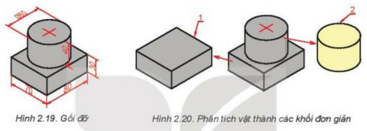 Gối đỡ được phân tích thành 2 khối đơn giản: khối hộp chữ nhật (1), khối trụ (2) (Hình 2.20).