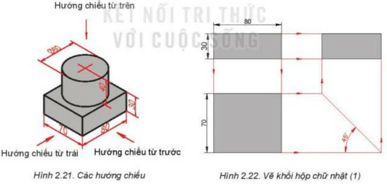 + Vẽ các hình chiếu của khối hộp chữ nhật (1) (Hình 2.22).