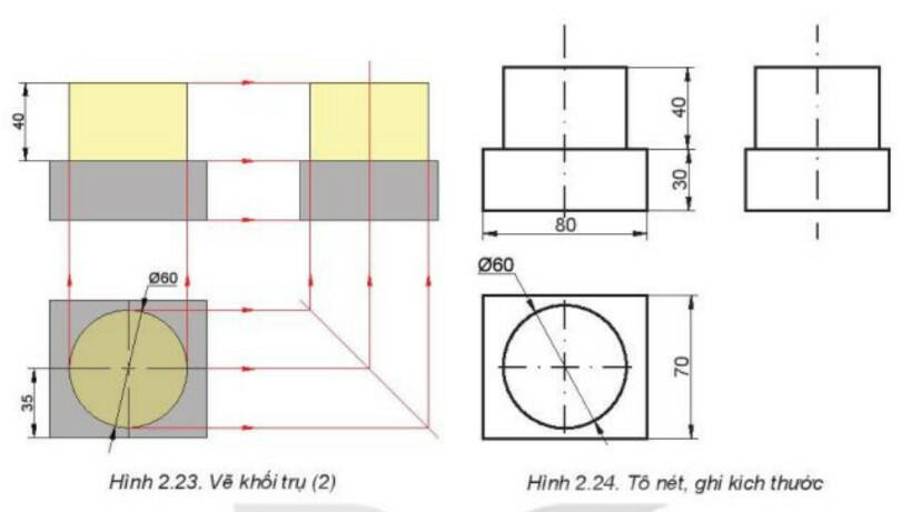+ Vẽ các hình chiếu của khối trụ (2) (Hình 2.23).