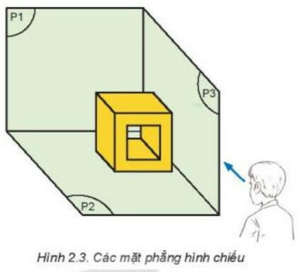 - Để biểu diễn chính xác hình dạng của một vật thể, thông thường phải sử dụng 3 hình chiếu vuông góc của vật thể lên 3 mặt phẳng hình chiếu khác nhau (Hình 2.3).