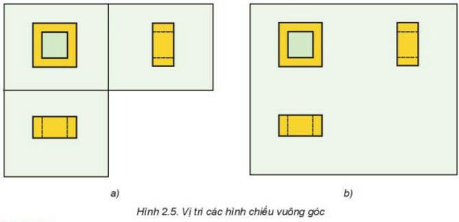 - Trên bản vẽ không vẽ các mặt phẳng hình chiếu nên bản vẽ các hình chiếu vuông góc sẽ được trình bày như trên Hình 2.5b.