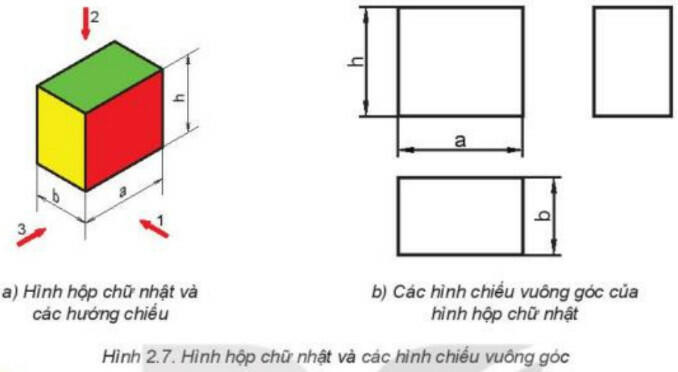 Hình 2.7b trình bày các hình chiếu vuông góc của hình hộp chữ nhật được mô tả ở Hình 2.7a.