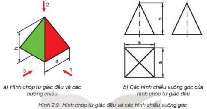 - Các hình chiếu vuông góc của hình chóp tứ giác đó có kết quả như Hình 2.9b.