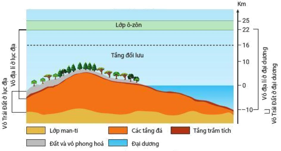 Giải thích: Vỏ địa lí bao gồm toàn bộ thủy quyển (giới hạn dưới của đại dương đến nơi sâu nhất), sinh quyển và bộ phận phía trên của thạch quyển cùng với phần khí quyển bên dưới lớp ô-dôn. Chiều dày của vỏ địa lí khoảng 30 - 35 km.