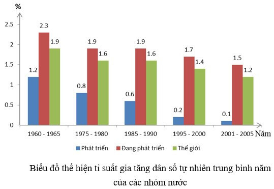 Giải thích: Gia tăng dân số tự nhiên biểu hiện sự thay đổi dân số do chênh lệch giữa số sinh và số chết. Tỉ suất gia tăng dân số tự nhiên là hiệu số giữa tỉ suất sinh thô và tỉ suất tử thô => Dân số trên thế giới tăng lên hay giảm đi là do sinh đẻ và tử vong.