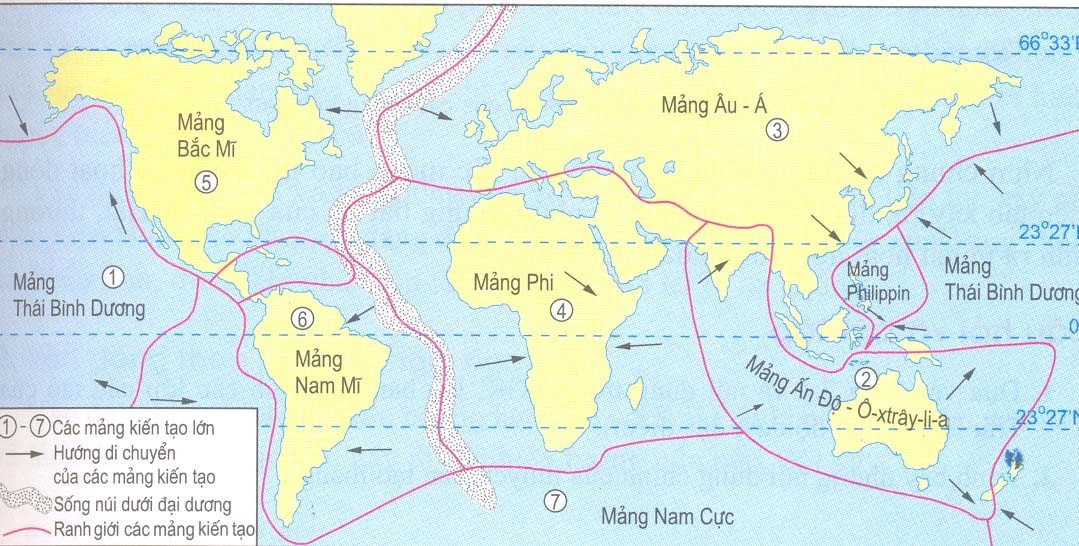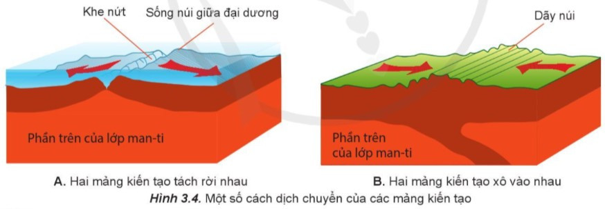 Giải thích: Mỗi mảng kiến tạo đều trôi nổi và di chuyển độc lập với tốc độ chậm (chỉ khoảng vài cm/năm). Trong khi dịch chuyển, các mảng có thể tách rời nhau, xô vào nhau; kết quả là tạo ra các sống núi ngầm, động đất, núi lửa, các dãy núi trẻ,...
