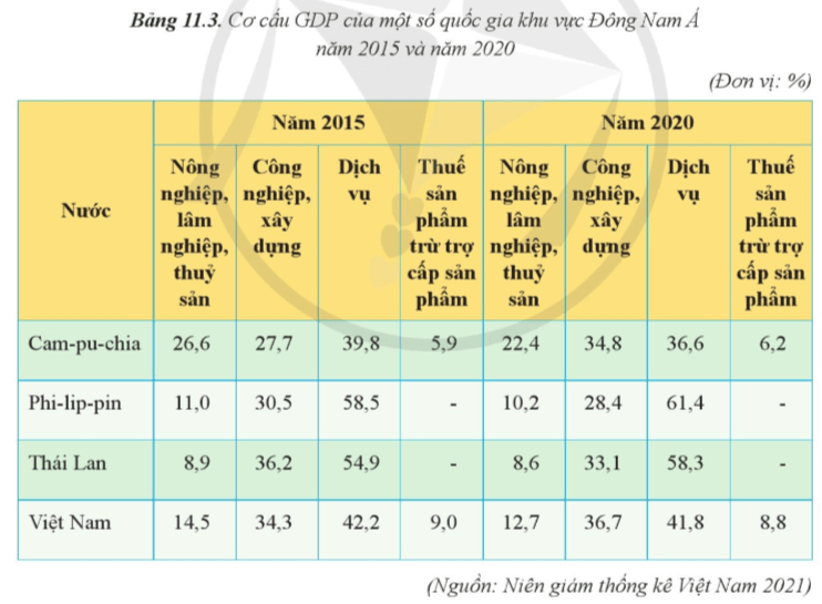 - GDP của khu vực Đông Nam Á tăng khá nhanh, đạt mức 3083,3 tỉ USD (năm 2020). Trong đó, In-đô-nê-xi-a là nước có GDP cao nhất khu vực.
