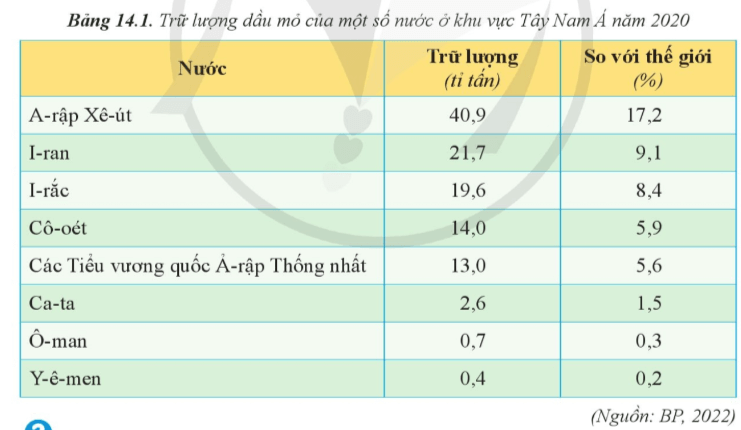 Câu 13. Quốc gia nào có trữ lượng dầu mỏ lớn nhất khu vực Tây Nam Á?
