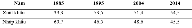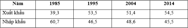 D. Tỉ trọng giá trị nhập khẩu giảm ở giai đoạn 1985 - 1995 và giai đoạn 2004 - 2014; tăng ở giai đoạn 1995 - 2004.
