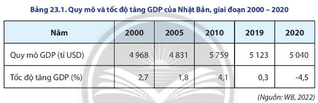 - Hiện nay, Nhật Bản là nước có quy mô kinh tế lớn: năm 2020, quy mô GDP của Nhật Bản đạt trên 5000 tỉ USD, đứng thứ ba thế giới, chiếm khoảng 6% GDP toàn thế giới.