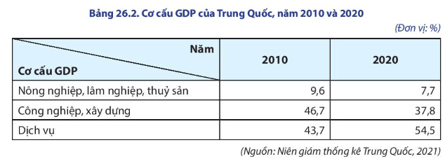- Dịch vụ là ngành có tốc độ phát triển rất nhanh và chiếm tỉ trọng cao nhất trong GDP của Trung Quốc. Năm 2020, ngành dịch vụ thu hút đến 47,3% lao động của nền kinh tế.
