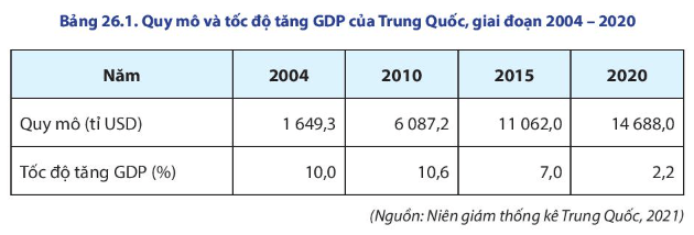 - Quy mô GDP của Trung Quốc tăng nhanh và liên tục, đạt 14722,7 tỉ USD (năm 2020), trở thành nước có quy mô GDP đứng thứ 2 thế giới, sau Hoa Kỳ.