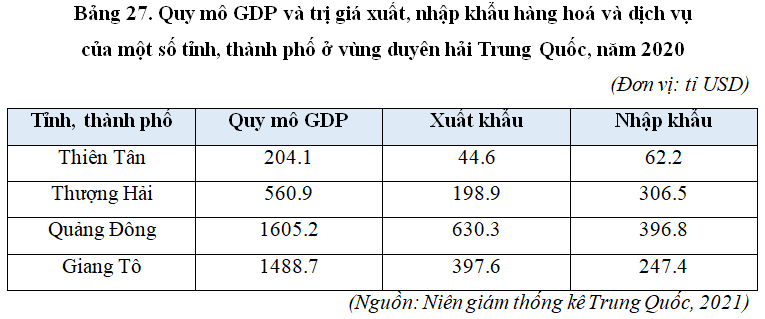 - Kể từ khi cải cách và mở cửa, các tỉnh ven biển đã dần trở thành một trong những khu vực năng động nhất Trung Quốc do có vị trí địa lí và điều kiện tự nhiên thuận lợi, khả năng giao thương với các nước khác, nguồn lao động dồi dào, trình độ cao, cơ sở hạ tầng kĩ thuật được đầu tư và chính sách ưu đãi của quốc gia. Vì vậy, vùng duyên hải Trung Quốc có nền kinh tế phát triển mạnh và đóng góp đáng kể vào GDP của quốc gia. Năm 2021, GDP của vùng này chiếm khoảng 55% GDP của Trung Quốc. Trong số các tỉnh, thành phố ở vùng duyên hải, Quảng Đông có GDP cao nhất, là trung tâm kinh tế quan trọng hàng đầu của vùng. Thiên Tân, Thượng Hải vừa là trung tâm thương mại, du lịch vừa là các thành phố cảng nổi tiếng của Trung Quốc. Vùng duyên hải còn có nhiều trung tâm công nghiệp công nghệ cao hàng đầu như Sơn Đông, Giang Tô,...