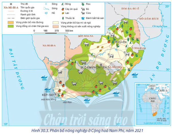 + Các vùng chuyên canh nông nghiệp ở Cộng hòa Nam Phi đã được hình thành như vùng phân bố lúa mì và ngô, vùng phân bố mía đường, vùng đồng cỏ chăn nuôi, vùng phân bố cây ăn quả,