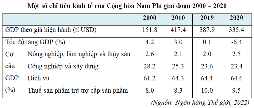 - Cộng hòa Nam Phi tiến hành công nghiệp hóa sớm (từ những năm 60 của thế kỉ XX) và đã đạt được nhiều thành tựu quan trọng. Trong nhiều thập niên, cơ cấu kinh tế có sự chuyển dịch theo hướng công nghiệp hóa, hiện đại hóa, tỉ trọng khu vực dịch vụ khá cao và tăng nhanh.