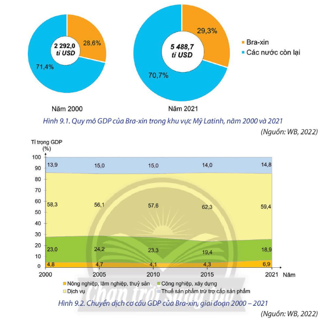 - Cơ cấu và chuyển dịch kinh tế: Trong giai đoạn từ năm 2000 - 2021, Cơ cấu GDP của Cộng hòa Liên bang Braxin có sự chuyển dịch rõ rệt, theo hướng: