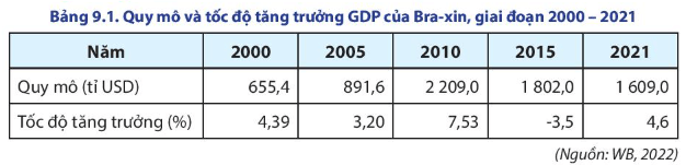 + Trong những năm gần đây, tốc độ tăng trưởng kinh tế của Bra-xin không ổn định: năm 2010, tốc độ tăng GDP của Braxin đạt mức 7.53%, tuy nhiên, tới năm 2015, tăng trưởng GDP sụt giảm, chỉ còn -3.5%. Với nhiều nỗ lực của chính phủ Braxin, tới năm 2021, tốc độ tăng trưởng GDP của quốc gia này đã tăng trở lại, đạt mức 4.6%.