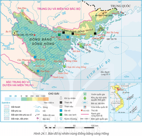- Địa hình và đất: địa hình đồng bằng diện tích lớn, đất phù sa màu mỡ ⇒ thuận lợi quy hoạch vùng chuyên canh cây lương thực, thực phẩm. Địa hình đồi núi ở phía bắc, rìa phía tây và tây nam với đất feralit ⇒ thuận lợi phát triển cây công nghiệp, cây ăn quả. Vùng ven biển Quảng Ninh, Hải Phòng nhiều đảo và quần đảo với cảnh quan đa dạng ⇒ phát triển du lịch. Ven biển có diện tích mặt nước ⇒ nuôi trồng thủy sản.
