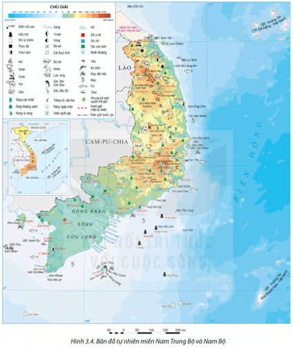 + Địa hình khá phức tạp, gồm các dãy núi, cao nguyên bazan xếp tầng, đồng bằng châu thổ rộng lớn và đồng bằng nhỏ hẹp ven biển. Trường Sơn Nam là dãy núi lớn, hình cánh cung có sự bất đối xứng giữa sườn đông và sườn tây. Các cao nguyên bazan tập trung ở Tây Nguyên và rìa Đông Nam Bộ với diện tích lớn, địa hình tương đối bằng phẳng. Đồng bằng sông Cửu Long rộng lớn, hệ thống kênh rạch chằng chịt, nhiều vùng trũng bị ngập nước vào mùa lũ. Dải đồng bằng ven biển Nam Trung Bộ nhỏ hẹp, bị chia cắt bởi các nhánh núi lấn ra biển. Vùng biển và thềm lục địa rộng lớn, giàu tài nguyên.